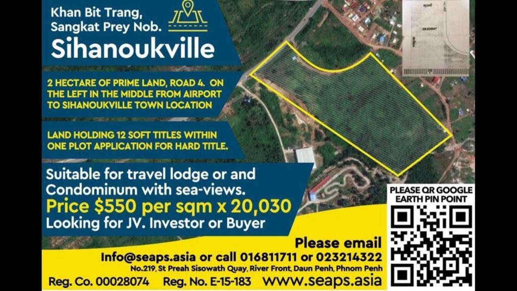 Lot 6: 2 hecteres of prime land. Khan Bit Trang, Sangkat Prey Nob. On the left half way between the airport and Sihanoukville town.